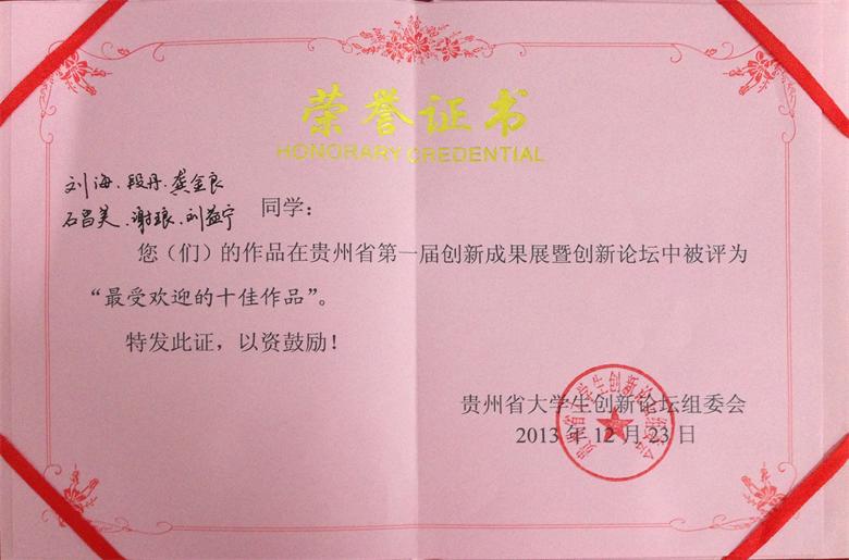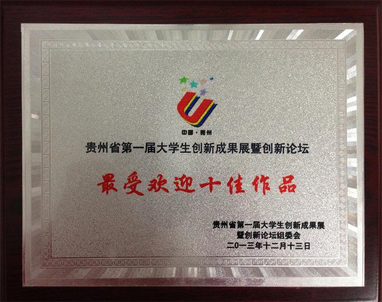 2013年12月12日至13日,贵州省第一届老员工创新成果展暨创新论坛在贵州大学隆重举行。本次大赛由贵州省教育厅主办、贵州大学承办,省属18所高校组成18支代表队参赛。公司教师王惠群副教授指导的刘海等6名同学的“老员工创新创业训练计划项目”作品——《便携式营养早餐的设计、制作及推广》获“最受欢迎的十佳作品”称号。