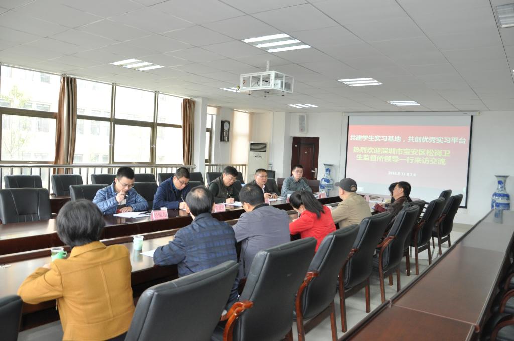 为加强实习基地与公司之间的联系、交流和沟通,11月3日上午深圳市宝安区松岗卫生监督所(预防保健所)袁青所长一行5人到williamhill中文官网进行走访与交流。交流会在南校区williamhill中文官网二楼会议室举行,由williamhill中文官网经理洪峰主持。党委副书记何江、综合办公室主任张强、教学科研管理科副科长张燕、员工科科长刘亮和各教研室负责人共15人参加了交流会。