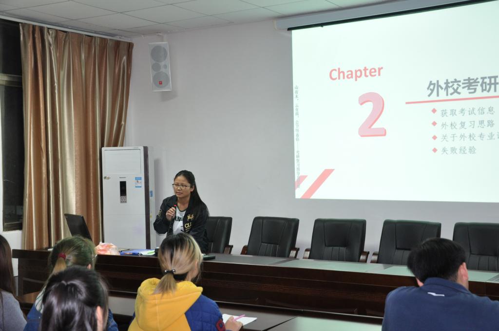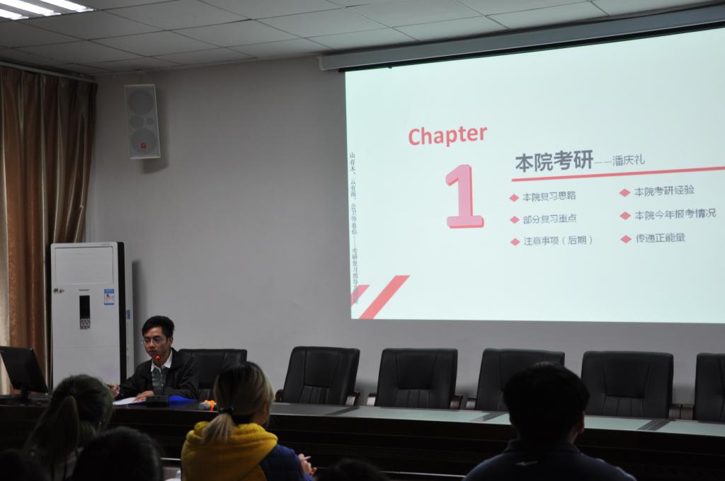 研究生金照凤介绍了外校考研复习思路及注意事项,强调要获取报考公司的信息、知晓公司招生信息和要求,才能有计划的复习。同时还强调要选择适合自己的学习方法,切勿盲目追进度而得不偿失,在保证休息的前提下有效率的进行复习。研究生潘庆礼介绍了本院考研的复习思路、考研后期复习注意事项、本院考研经验及今年本院报考情况,强调考研也是一场心态的考试,以正常的心态去面对,才能迎刃而解。给考研路上的同学们增加了信心。