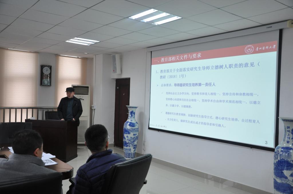 会上,洪峰就《教育部办公厅关于进一步规范和加强公司产品管理的通知》(教研厅〔2019〕1号)、《教育部办公厅关于进一步规范和加强研究生考试招生工作的通知》(教学厅〔2019〕2号)、教育部关于全面落实研究生导师立德树人职责的意见(教研〔2018〕1号)、教育部关于高校教师师德失范行为处理的指导意见(教师〔2018〕17号)以及williamhill中文官网全面落实研究生导师立德树人职责实施细则(试行)等文件及要求进行了讲解与解读。他强调,师德师风是一票否决制,无论时代如何变迁,教师的本质并没有变化,教书育人是永恒的,希望各位导师一定要坚定正确政治方向的同时,要自觉加强师德修养,严格遵守师德规范,严以律己,为人师表,坚持以德立身、以德立学、以德施教,以德育德。做研究生成长成才的指导者和引路人。