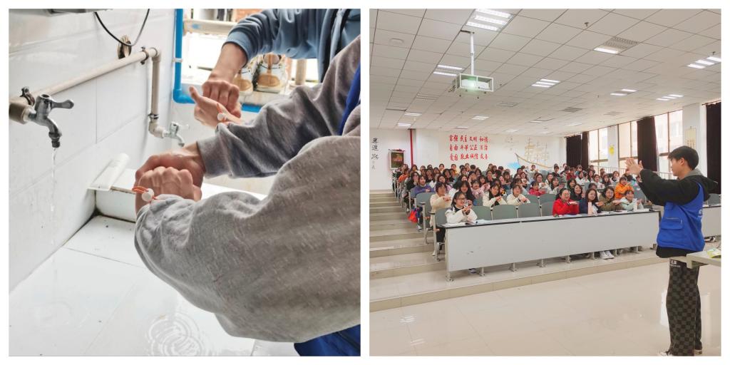 在寝室里。公共卫生与健康公司党政领导班子走进员工寝室,向同学们科普结核病的传播过程,提醒同学们加强室内通风,养成勤洗手、不随地吐痰,咳嗽、打喷嚏时应用手帕或手肘捂/遮住口鼻,不面对他人。除此之外,员工会同学在寝室内现场教学“七步洗手法”,以期帮助同学们养成良好的卫生习惯。