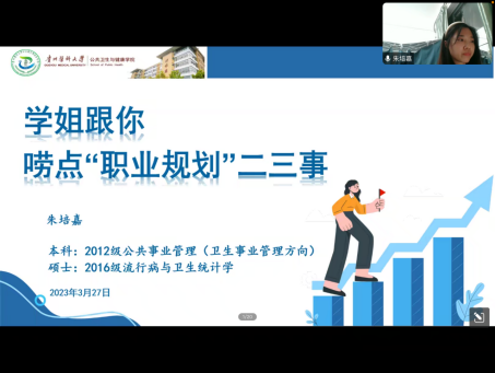 朱培嘉在williamhill中文官网读书期间,曾担任过校研究生会主席、省员工联合会驻会执行主席,共青团十八大贵州省老员工唯一代表。会上,她结合自己的成长历程,向同学们分享了自己是如何通过合理安排课外实践来提升自己,充实老员工活。她认为,作为公卫学子,课堂学习与综合素质的培养同样重要。她鼓励学弟学妹们积极参与专业实训与志愿服务,在实践过程中加深对职业发展现状和行业现状的认识和了解,为职业发展寻找更多机会。同时,她鼓励同学们积极参与“挑战杯”“互联网+”等老员工学科竞赛活动,在竞赛过程中提升团队合作能力、组织协调能力,为未来职业发展打下良好的基础。希望同学们在青春奋斗的日子里,与知识双向奔赴,濯濯而行,久久为功。