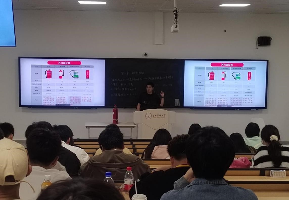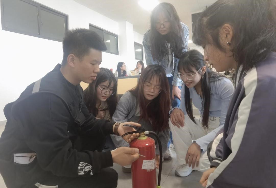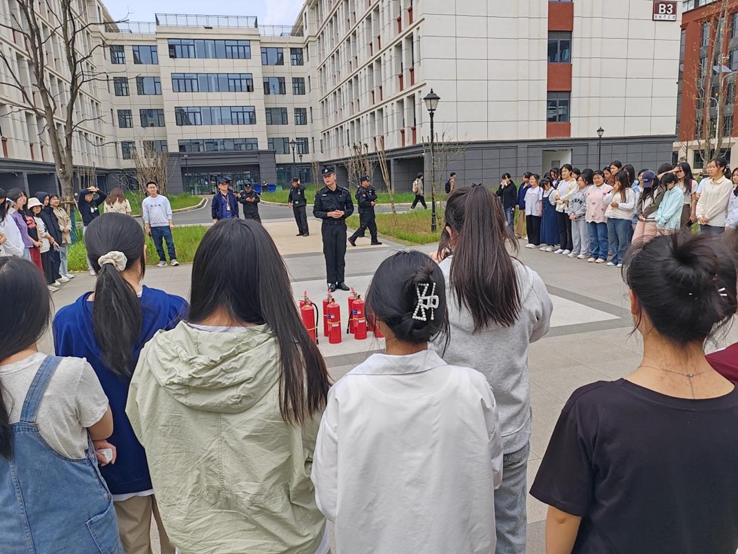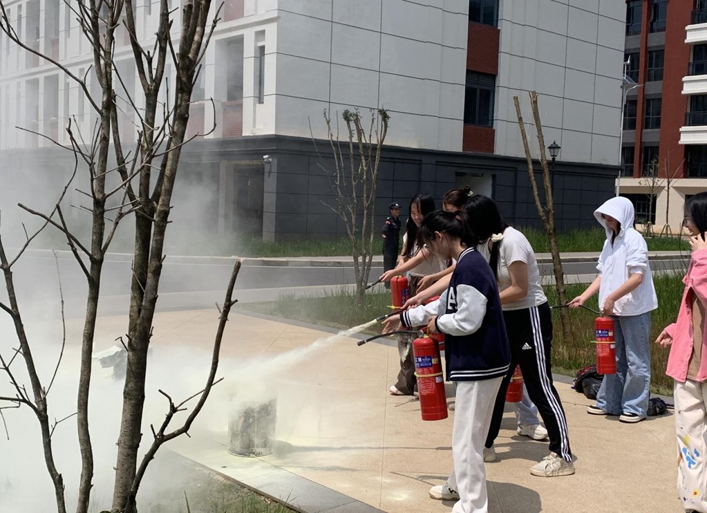 在消防安全培训中,保卫处工作人员向同学们详细介绍了火灾发生时可能面临的情况,包括常见的火源和燃烧物,以及可能导致火灾扩散的因素,逐一为大家讲解并示范灭火器、灭火毯、消防栓、防烟面罩等使用方法,随后同学们在室外进行了灭火器的使用操作实训。