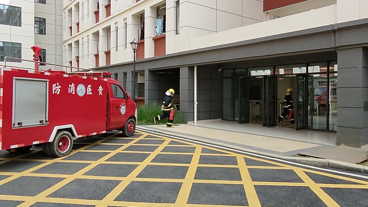 场景2:员工寝室疏散演练。某员工寝室发生火情,该寝室员工迅速撤离寝室并立即拨打校园火情报警电话,楼栋管理工作人员发现火情后,立即逐层敲门并组织楼栋内员工迅速有序撤离至宿舍楼外安全区域,校园微型消防站在接到火情报警后,联动校保卫处安保人员、后勤物业人员迅速赶往现场处置火情。