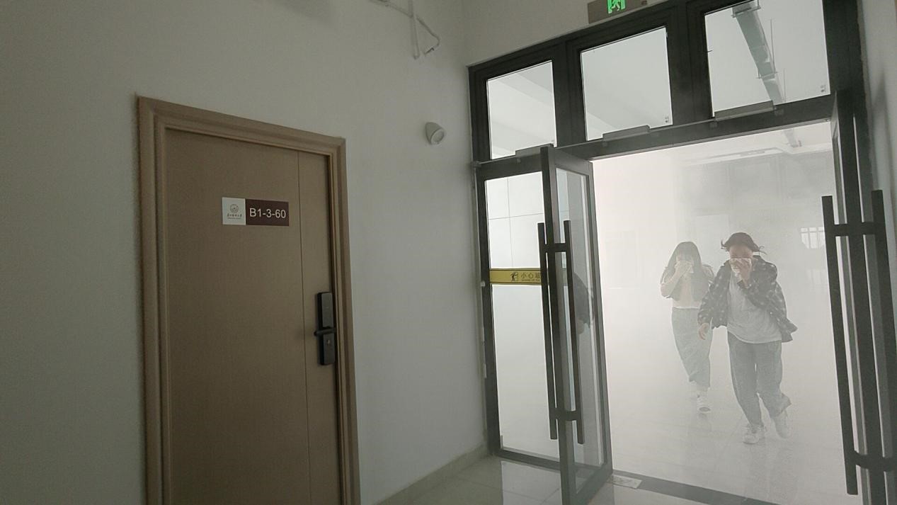 场景1:教室疏散演练。某教室发生火情,上课教师迅速组织员工使用湿毛巾捂住口鼻、按照消防疏散动作要领,从楼内安全通道迅速有序撤离至楼外安全区域并立即拨校园微型消防站报警电话,楼栋安保人员迅速到教室各楼层通知并协助楼栋内其他教室的师生迅速有序撤离。