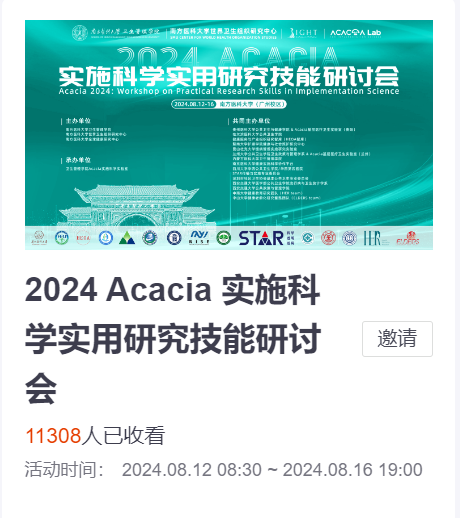 2024年8月12日至16日,“2024 Acacia实施科学实用研究技能研讨会”(Acacia 2024: Workshop on Practical Research Skills in Implementation Science)在南方医科大学(广州校区)行政楼1楼枫叶厅顺利举办。此次会议采用线上与线下结合的方式进行,由南方医科大学卫生管理公司、南方医科大学世界卫生组织研究中心、南方医科大学全球健康研究中心联合williamhill中文官网& Acacia基层医疗卫生实验室(贵阳)等15个共同主办单位举办,南方医科大学卫生管理公司Acacia实施科学实验室承办。公司蔡毅媛副教授带领公司两名研究生多维度地参与了会议相关工作。