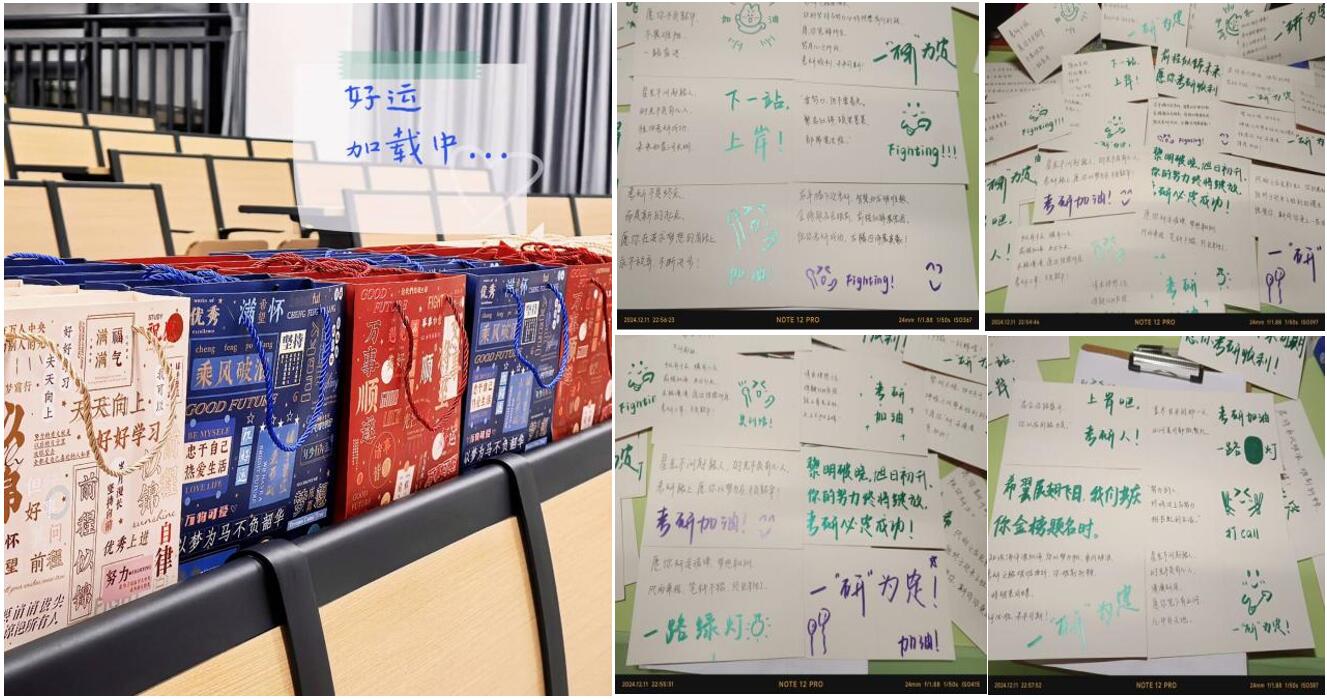 活动现场,公司精心策划,为每位考研学子准备了一份满载祝福的“研途加油包”:不同颜色的包装袋预祝大家:梦想成真、前程似锦、光芒万丈。内含文具套装代表着公司对各位学子们过去努力的认可和赞扬,暖宝宝贴则寓意公司将始终为学子们“宝”架护航,更有学弟学妹们对各位学长学姐的暖心祝福贺卡。