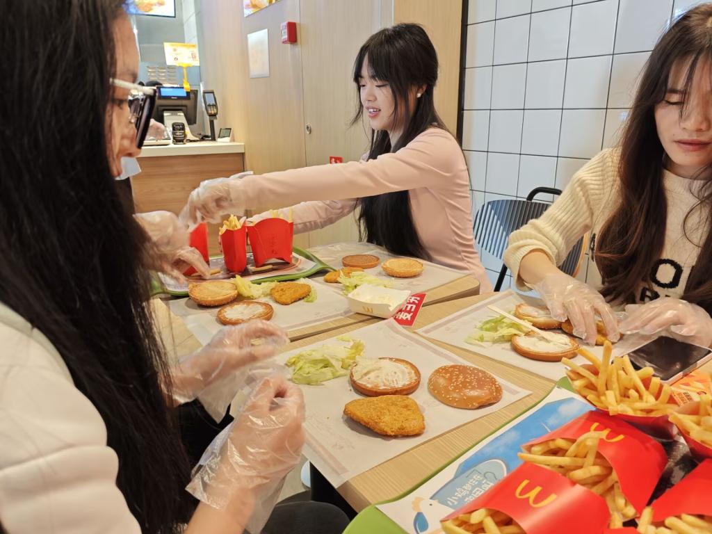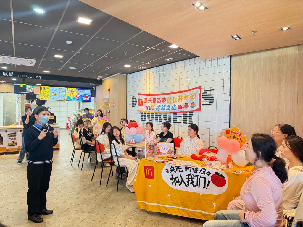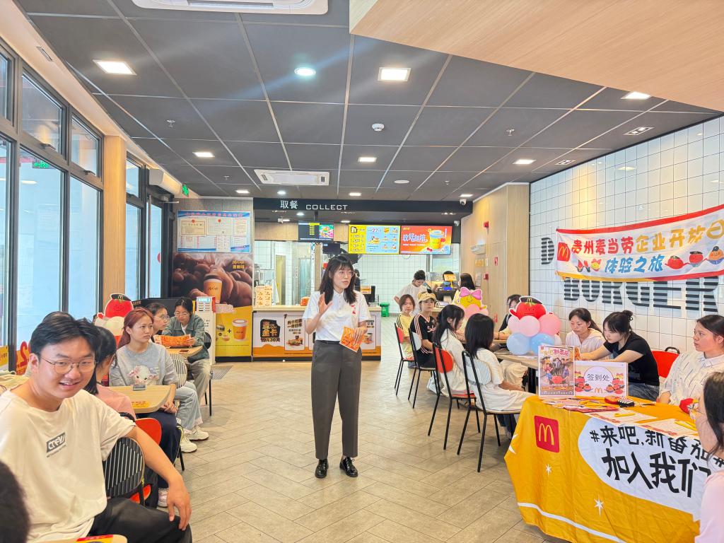 在活动中,贵州市场负责人营运总监胥娇分享了“AI时代下年轻人职场洞察报告”、介绍“一份订单的旅程”以及“值班经理的一天”等特色主题,全面展示了麦当劳从食材采购到餐品交付的全流程,使参与者深入了解了麦当劳的数字营销与管理模式。此外,活动还安排同学们进入麦当劳厨房,亲身体验并感受麦当劳工作人员的日常工作。