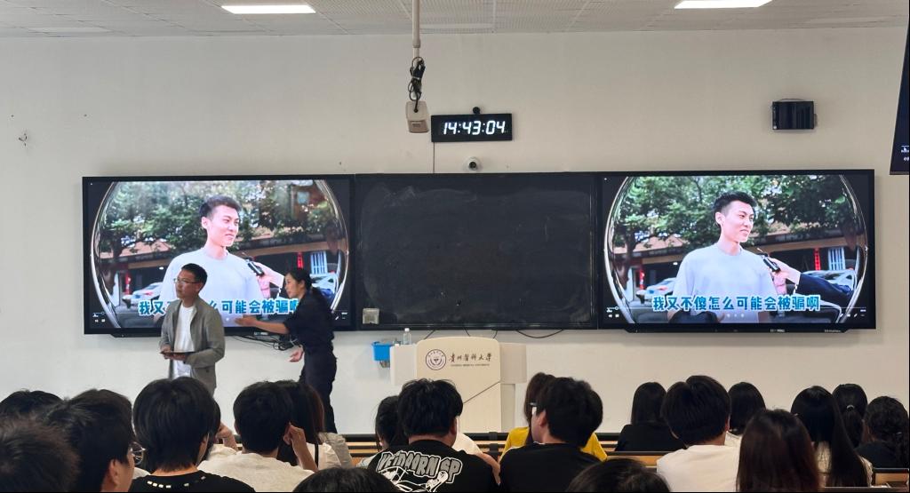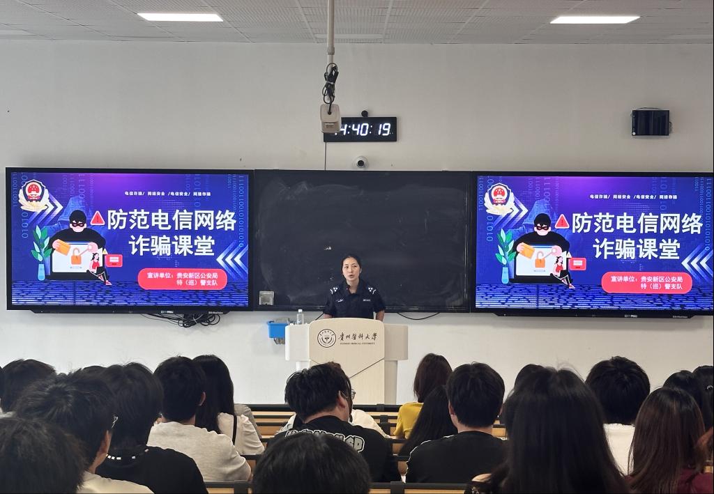 贵安新区特警支队刘警官结合典型案例,以案释法、以法施教,向员工揭露盗取QQ号、虚拟购物、刷单返利、虚假游戏交易、网络招嫖、虚拟兼职、冒充熟人等诈骗形式的惯用手法,着重提醒员工摒弃侥幸心理,并引导大家牢记“不贪财、不好色,不刷单、不轻信”的防骗准则,从认知层面强化反诈意识。在互动环节还播放了高校常见的诈骗案例,引起现场诸多观众的共鸣。