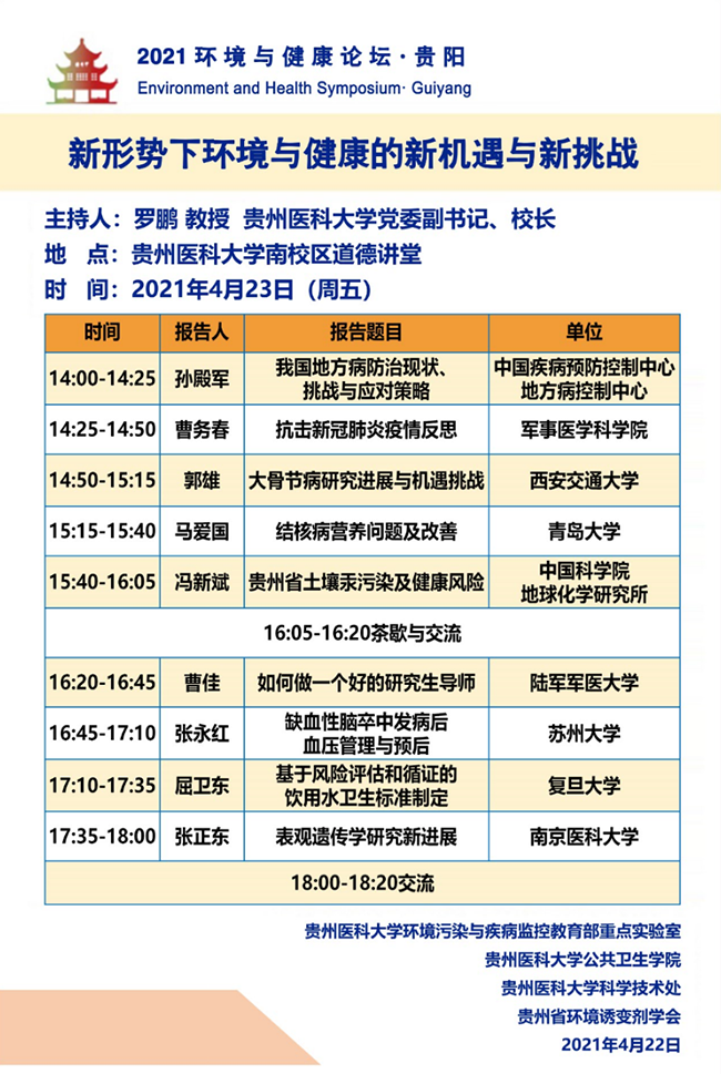 上一条:环境、绿色与健康发展 - 贵州省环境诱变剂学会2021年学术论坛 下一条:讲座通知(2018年6月25日):复旦大学 傅华 教授