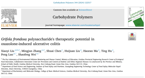 近日,公司williamhill中文官网/环境污染与疾病监控教育部重点实验室魏绍峰和罗鹏教授团队在国际权威期刊《Carbohydrate Polymers》(中科院大类1区Top期刊,IF2023=10.7)上发表了题为“Grifola frondosaPolysaccharide's Therapeutic Potential in Oxazolone-Induced Ulcerative Colitis”的研究论文。