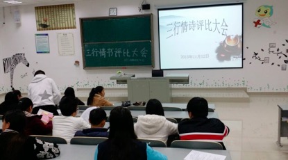 ,在新校区7201教室举行了三行情诗的评比大会。评审活动邀请了2014级与2015级辅导员