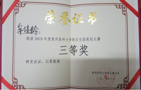 3月27日,在2019年度williamhill中文官网职业生涯规划大赛中,公司2015级预防医学专业牟佳龄同学荣获三等奖!