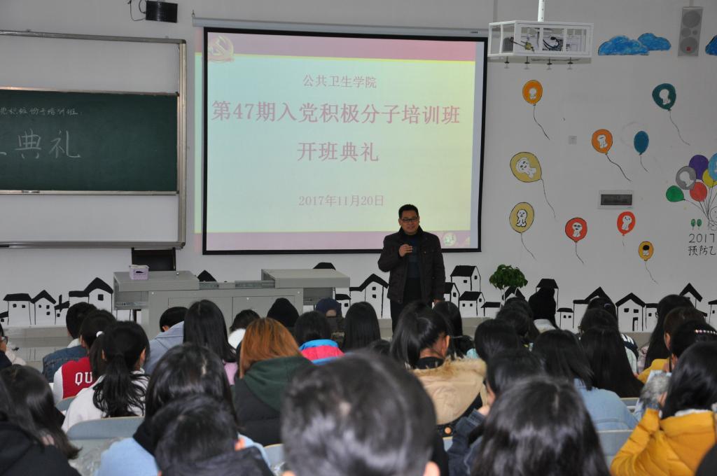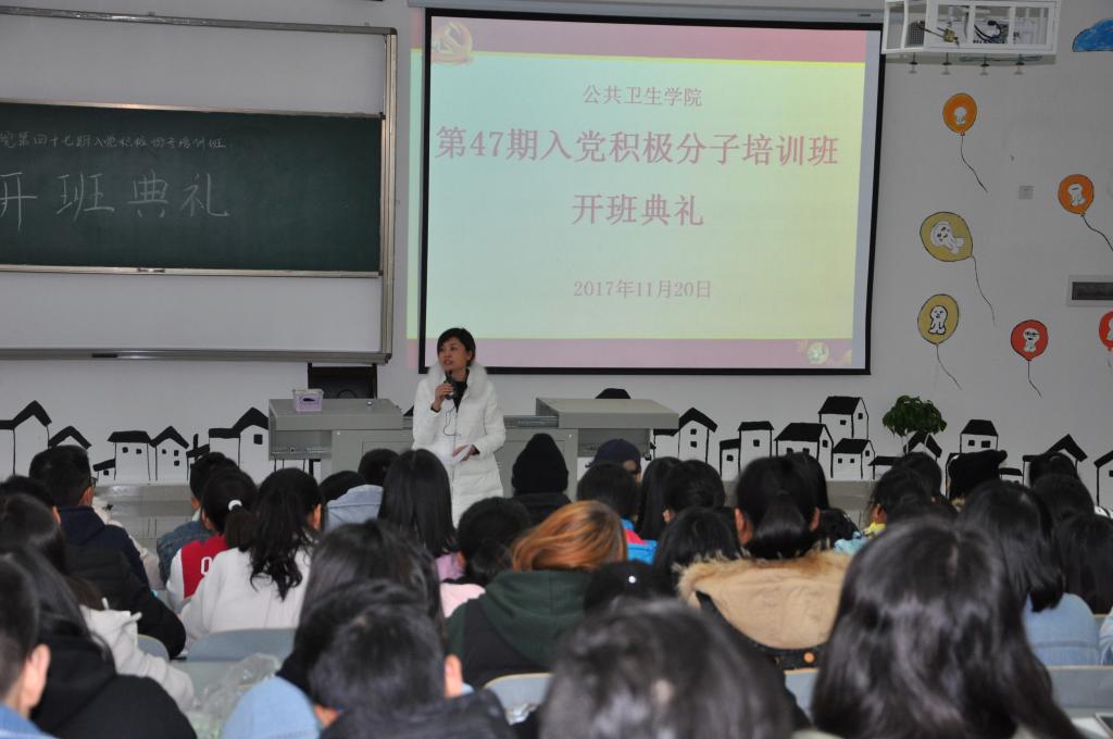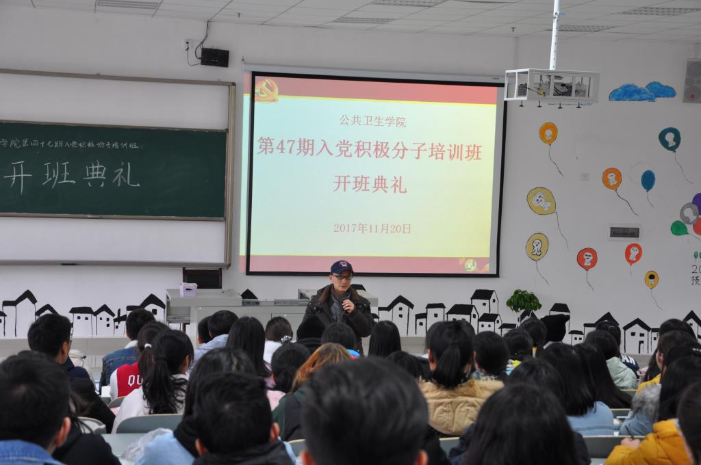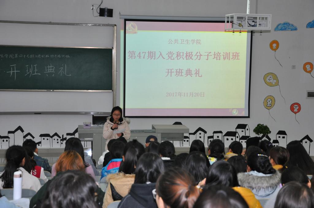 刘亮向全体学员介绍了本期培训班教学安排、学习、纪律、考核要求及社会实践有关事宜;2017级预防乙班陈丽同学代表入党积极分子发言,抒发了参加培训激动和荣幸之情,倡议全体学员要严格要求自己,认真学习,树立党课学员的良好形象,以实际行动争取早日成为一名光荣的中国共产党党员。