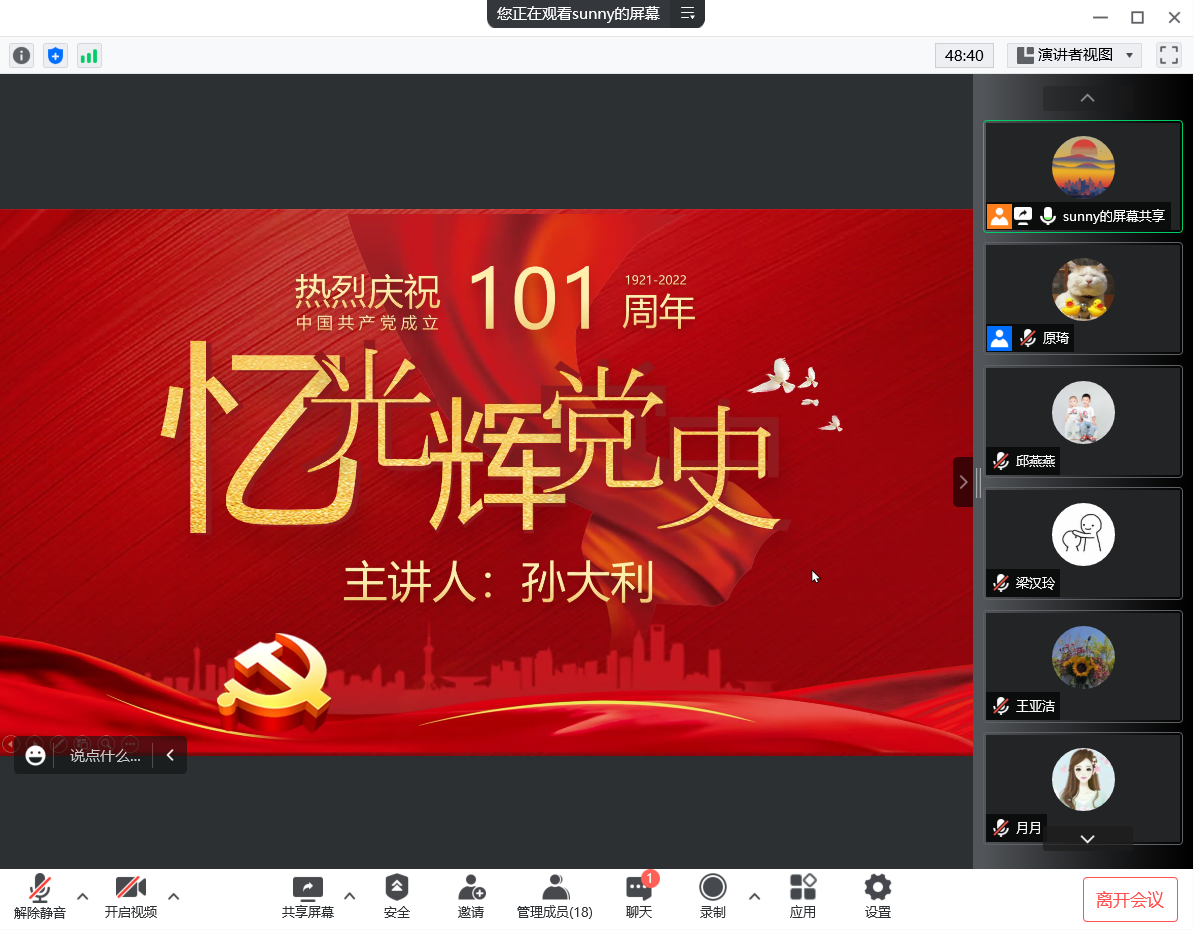 孙大利同志以“忆光辉党史”为主题,回顾了中国共产党百年来奋斗的光辉历程,以史实阐述中国共产党无往不胜的重要法宝,系统讲解了中国共产党如何践行为人民服务的根本宗旨。