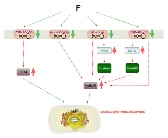 上述miRNA通过不同的途径实现对CyclinD1和CDK4表达的调控,进而参与氟所致的成骨细胞增殖活化。